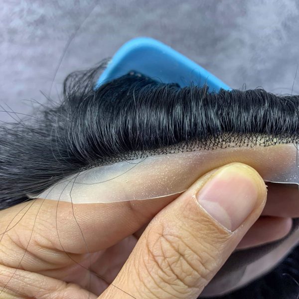 Mẫu Toupee kiểu dáng Q6 với thiết kế kết hợp giữa lưới lace và màng PU kết hợp, Viên PU trong suốt vòng từ phía bên tai ra đằng sau đầu giúp người dùng có thể sử dụng keo dán/Băng dính để dán trực tiếp lên da đầu hoặc có thể gắn thêm các clip kẹp phím bấm để ghim tóc giả vào với tóc thật của mình. Phía giữa và đằng trước trán mẫu Q6 được làm bằng lưới Lace, phía trước trán Q6 là lưới Lace nên giúp người sử dụng khi dùng có thể vuốt ngược tóc lên mà không sợ bị lộ, lưới Lace ở giữa đầu giúp thoáng khí, mát đầu khi sử dụng